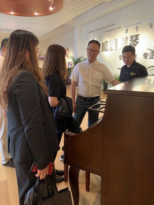 李董一行先后參觀了威騰鋼琴生產車間、產品展示廳、黨建辦公室等。